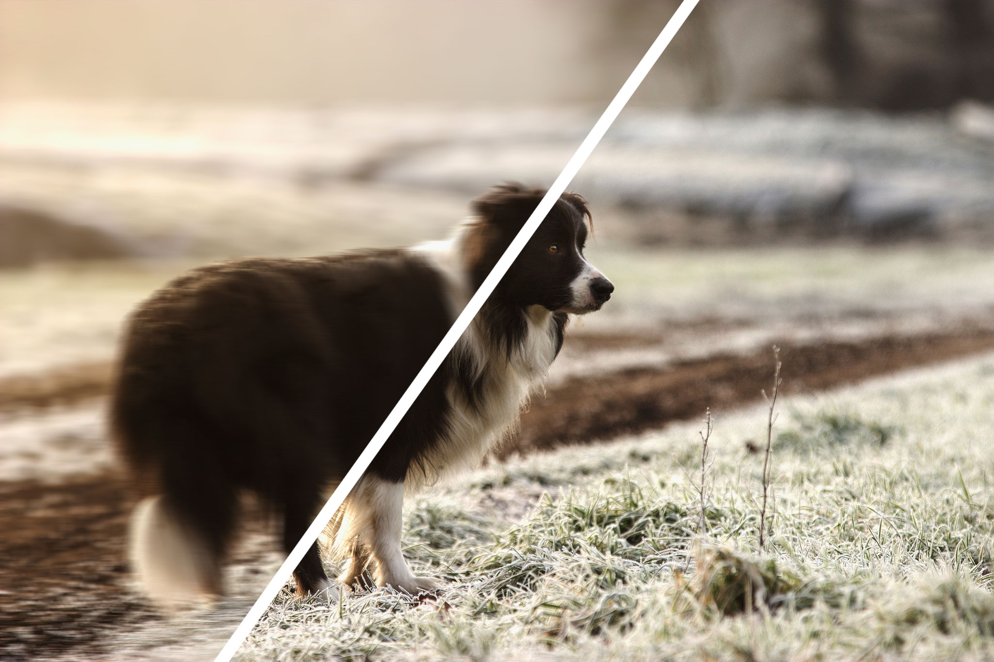 Wenn sich mein Motiv im Verhältnis zur gewählten Belichtungszeit zu schnell bewegt, kommt es zwangsläufig zur sogenannten Bewegungsunschärfe. Bei rennenden oder spielenden Hunden zum Beispiel versuche ich immer eine Belichtungszeit von 1/1200 zu erzielen. Dazu stelle ich im manuellen Modus zuerst die Belichtungszeit ein, als zweites wähle ich die gewünschte Blende. Sollte mein Bild dann zu dunkel werden, kann ich die Helligkeit meines Bildes über die ISO (Lichtempfindlichkeit des Sensors) korrigieren. Wenn die Bilder bei zu hoher ISO verrauschen muss ich mich leider entscheiden, ob ich ein rauschen oder eine Bewegungsunschärfe in Kauf nehme.